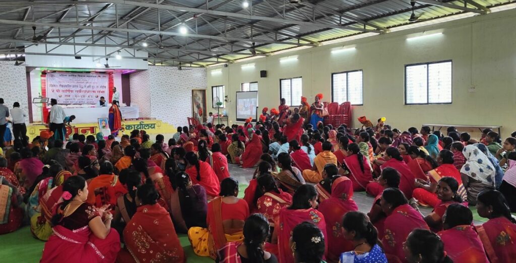 The Bachatgat is governed by a government-aided organization called Umed. The annual function was jointly organized by the Mahila Aarthik Vikas Mahamandal-MAVUM (Women’s Financial Progress Corporation) and Maharashtra Rajya Grameen Jeevanotthi Abhiyan (Maharashtra state Rural Livelihood Mission). Women who participated in the Bachatgat of about 10 villages assembled in a community hall in Kamti village. That is roughly about 100-200 women per village. Dr. Kusum learnt that several women leaders had organized the logistics and curated the 3-hour-long program, especially the CRPs (Community representatives). The women in the picture below, with orange turbans are the CRPs of the region. However, all the people who took up space and time on stage were men. She wondered how ironic this was, especially for a program organized to celebrate women’s progress.